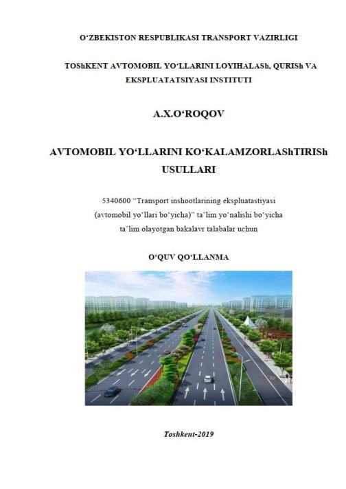 Toshkent davlat transport universiteti Ilmiy-uslubiy kengashi tomonidan 60730800 - “Yo‘l muhandisligi (avtomobil yo‘llarini qurish)”, 60730800 – “Yo‘l muhandisligi (avtomobil yo‘llarini arxitektura-landshaft konstruksiyalash)” ta’lim yo‘nalishlari bakalavriat talabalari va professor-o‘qituvchilar uchun tavsiya etilgan o‘quv qo‘llanma.