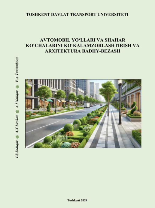 Avtomobil yoʻllarini va shahar koʻchalarini koʻkalamzorlashtirish va arxitektura badiiy bezash (arxitektura badiiy bezash). I.S.Sodiqov, A.X.Oʻroqov, A.I.Xoliqov, F.A.Tursunboyev. Oʻquv qoʻllanma. T.: “Transport” nashriyoti, 2023 y., 165 b.