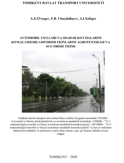 Аvtomobil yo‘llari va shahar ko‘chalarini ko‘kalamzorlashtirish ekinlarini agrotexnikasi va sug‘orish tizimi. A.X.O‘roqov, F.B. Ubaydullayev, A.I.Xoliqov. O‘quv qo‘llanma. T.: “Transport” nashriyoti, 2024 y., 170 b.