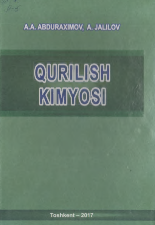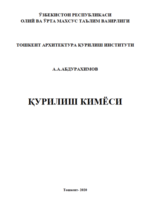 Abduraximov A.A. “Qurilish kimyosi” darslik – T., TAQI-2020, 375 bet.