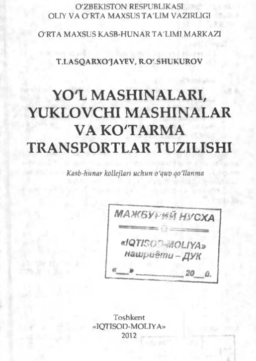Asqarxo‘jayev T.I. Yo‘l mashinalari, yuklovchi mashinalar va ko‘tarma transportlar tuzilishi: Kasb-hunar kollejlari uchun o‘quv qo‘llanma / T.I.Asqarxo‘jayev, R .O‘.Shukurov ; O 'zbekiston Respublikasi Oliy va o‘rta maxsus ta'lim vazirligi; O 'rta maxsus kasb-hunar ta'limi markazi. - Т.: «IQTISOD-MOLIYA», 2012, -288 b.