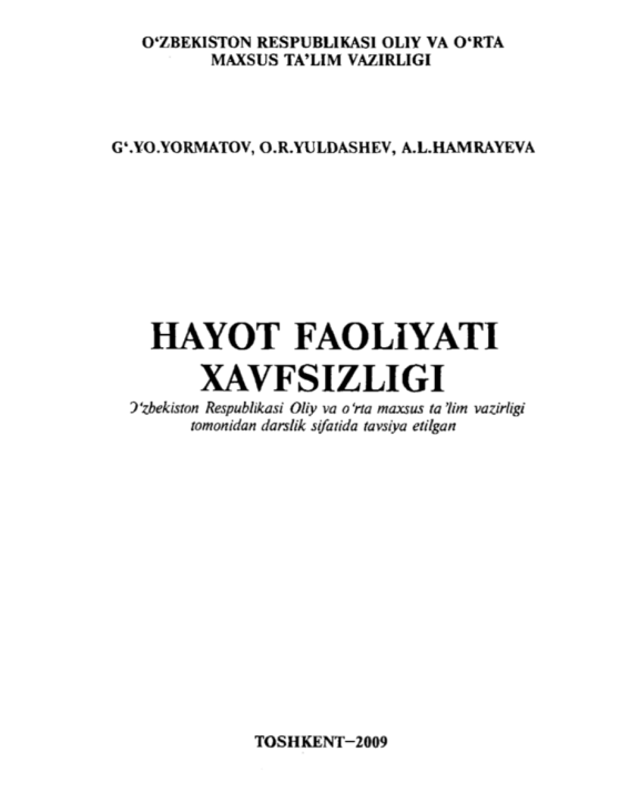 Yormatov G‘.Yo., Yuldashev O .R ., Hamrayeva A.L. Hayot faoliyati xavfsizligi (Darslik). T., «Aloqachi», 2009, 348 bet.