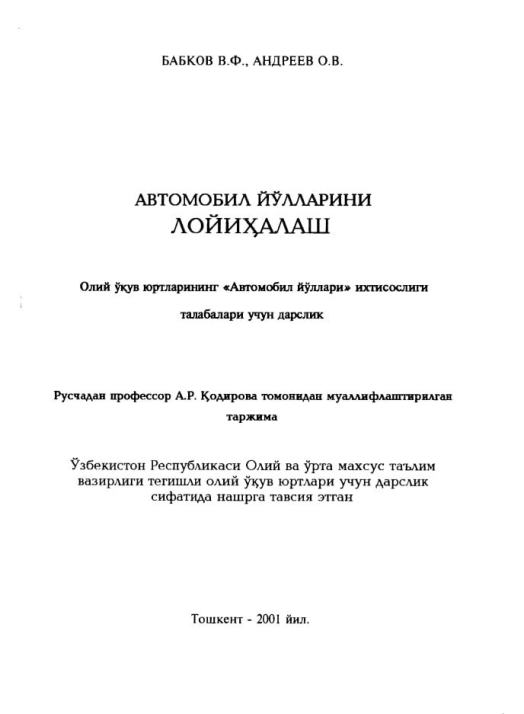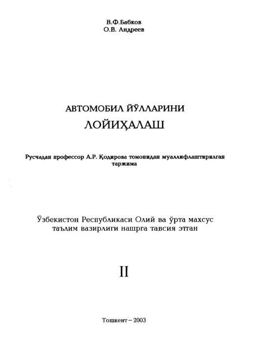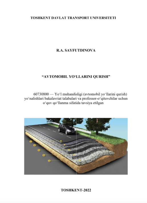Toshkent davlat transport universiteti Ilmiy-uslubiy kengashi tomonidan 60730800 — Yoʻl muhandisligi (avtomobil yoʻllarini qurish) yoʻnalishlari bakalavriat talabalari va professor-o‘qituvchilar uchun tavsiya etilgan o‘quv qo‘llanma.