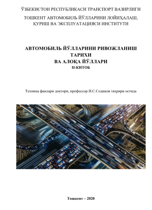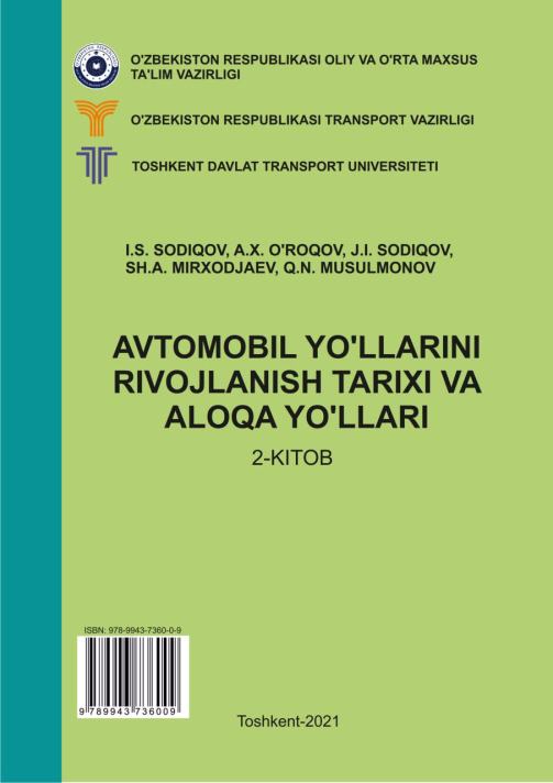 Avtomobil yo'llarini rivojlanish tarixi va aloqa yo'llari. I.S.Sodiqov, A.X.O'roqov, J.I.Sodiqov, Sh.A.Mirxodjayev, Q.N.Musulmanov. Darslik. T.:“Transport” nashriyoti, 2021 y., 321 b.
