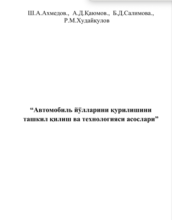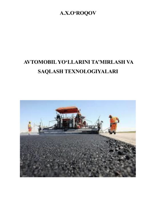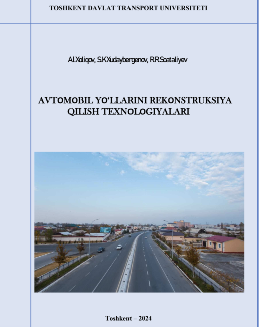 Avtоmоbil yо‘llarini rekоnstruksiya qilish texnоlоgiyalari. A.I.Xоliqоv, S.K.Xudaybergenоv, R.R.Sоataliyev. О‘quv qо‘llanma. T.: “Transpоrt” nashriyоti, 2024 y., 177 b.