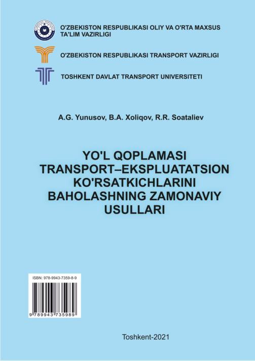 Yo'l qoplamasi transport–ekspluatatsion ko'rsatkichlarini baholashning zamonaviy usullari. A.G.Yunusov, B.A.Xoliqov, R.R.Soataliyev. O'quv qo'llanma. T.:“Transport” nashriyoti, 2021 y., 124 b.
