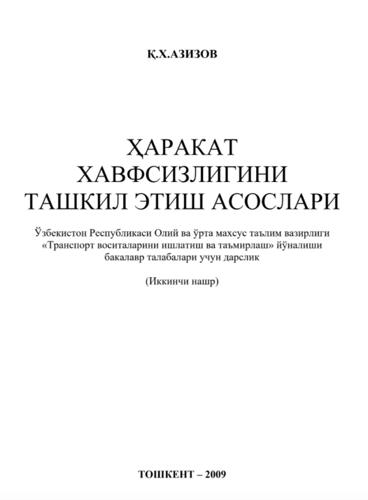 Shahar yo'llarida harakat xavfsizligini tashkil etish. Q.X.Azizov. Darslik. Toshkent. “Transport” nashriyoti, 2021 y., 227 b.