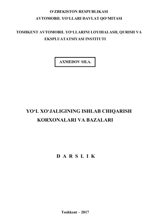 SH.A.Axmedov. Yo‘l xo‘jalagining ishlab chiqarish korxonalari va bazalari. Darslik – TAYLQEI 2017 y.