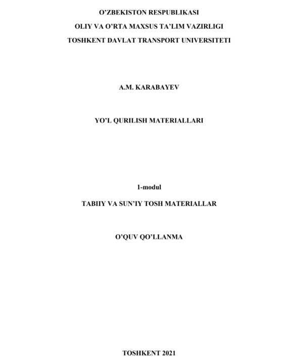 Karabayev A.M. Yo‘l qurilish materiallari. 1-modul. Tabiiy va sun'iy tosh materiallar. O‘quv qo‘llanma. – T.: 2021. – 105 bet.