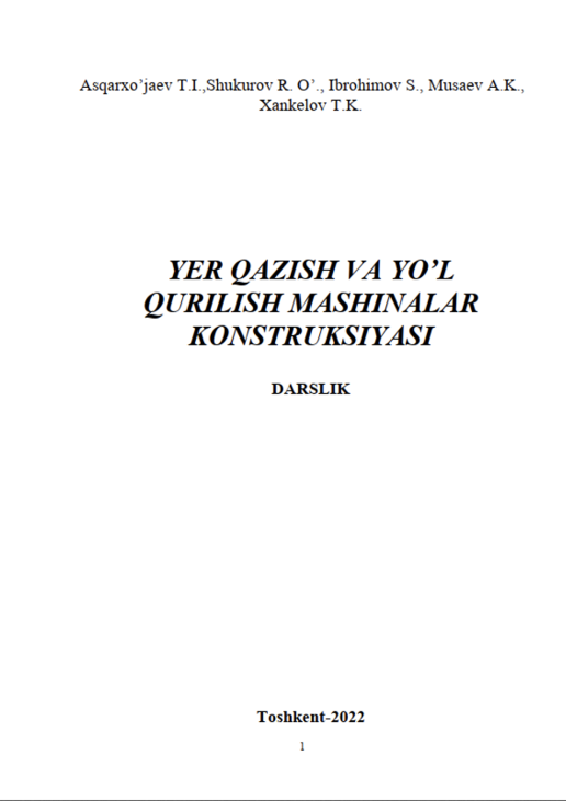 Yer qazish va yo‘l qurilish mаshinаlаr konstruksiyasi dаrslik. Аsqаrхo‘jаеv T.I.,Shukurov R. O‘., Ibrohimov S., Musaev A.K., Xankelov T.K. Toshkent-2022, 574 bet.