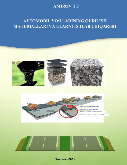 T. J. Amirov. Avtomobil yo‘llarining qurilish materiallari va ularni ishlab chiqarish. O‘quv qo‘llanma. Toshkent, 2023 y. Oʻquv qoʻllanma. T.: “Transport” nashriyoti, 2023 y., 291 b.